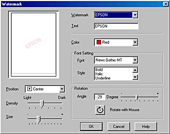 | Make sure that the appropriate watermark is selected in the watermark list box, then make Color, Position, Density, Size, Font, Font Style and Angle settings. For details, please see the online help. Your settings are reflected in the display at the left side of the dialog box. |
