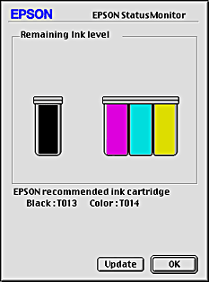 You can also use this utility to check ink levels before printing. When open, EPSON StatusMonitor displays the amount of ink remaining at the time it was opened. To update the ink level information, click the Update button.