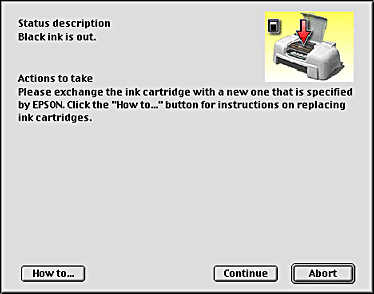 When the ink runs low or out, a How to button appears. Click How to and EPSON StatusMonitor will lead you step-by-step through the ink cartridge replacement procedure.