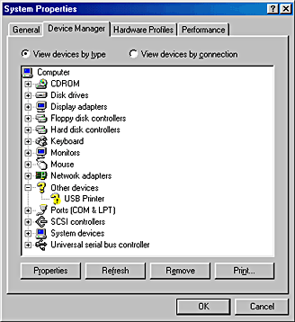 If USB Printer appears under Other Devices, the USB printer device driver is not installed correctly. If EPSON Stylus COLOR 580 appears, the printer driver is not installed correctly.