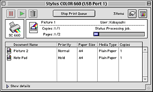 | Click the Show details arrow at the bottom of the EPSON Monitor3 dialog box, then click a document name in the Document Name box. You will see an extended dialog box similar to the one below. |