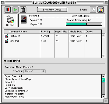 After you send a print job to the printer, you can use the EPSON Monitor3 utility to check, cancel, or change the priority of print jobs that are queued for printing. This utility also shows the status of the job currently being printed.