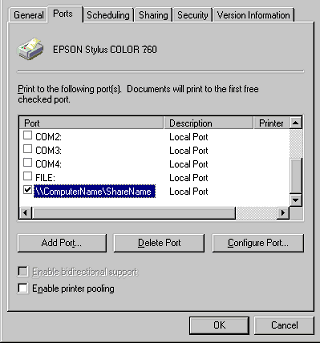 On the Ports menu, make sure that the new port is added and the check box is selected. Click OK to close the printer driver.