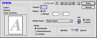 | Depending on the media you choose in the Media Type list while Automatic is selected, a slide bar appears in the Mode box that lets you choose Quality, Speed or an intermediate setting. Select Quality when print quality is more important than speed. |