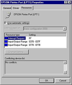 | Click the Resources tab, then deselect the Use automatic settings check box. Write down the Input/Output Range settings shown in the Resource settings box. |