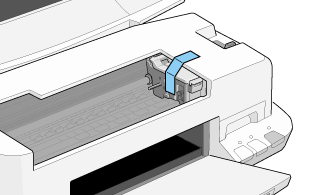| Open the printer cover again. Secure the ink cartridge holder to the printer with tape as shown below, then close the printer cover. |