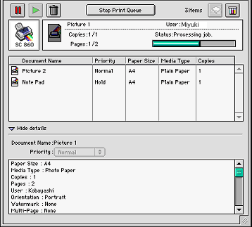 | Click the Show details arrow at the bottom of the EPSON Monitor3 dialog box, then click a document name in the Document Name box. You will see an extended dialog box similar to the one below. |