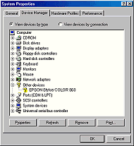 If EPSON USB Printer Devices does not appear in the Device Manager menu, click the plus (+) sign beside Other Devices to view the installed devices. If USB Printer appears under Other Devices, the USB printer device driver is not installed correctly. If EPSON Stylus COLOR 860 appears, the printer driver is not installed correctly.