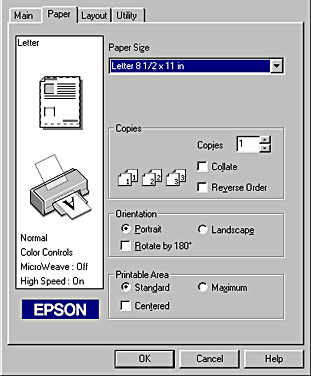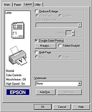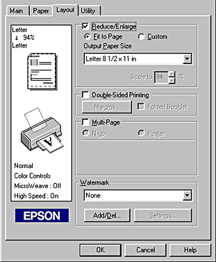 On the Paper menu, you can specify the paper size, the number of copies, the orientation of your printout, and the printable area. On the Layout menu, you can automatically match the document size to the paper size, print on both sides of the paper, print two or four pages on a single sheet of paper, print poster-size images by enlarging one page to cover several sheets, or place watermarks on documents. Refer to the appropriate section below for details.