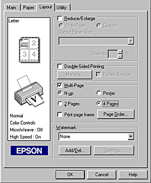 Select N-up as the Multi-Page setting on the Layout menu to print two or four pages of your document on one sheet of paper.