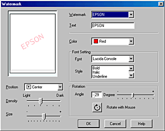 Make sure that the appropriate watermark is selected in the Watermark list box, then make Color, Position, Density, Size, Font, Font Style and Angle settings. For details, please see online help. Your settings are reflected in the display at the left side of the dialog box.