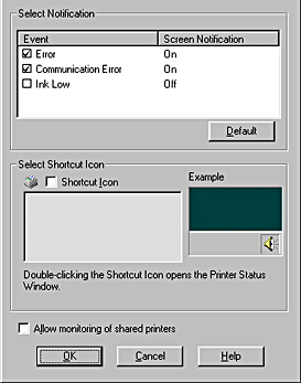 Select the Shortcut Icon check box to have a shortcut icon placed in your Windows taskbar. Clicking the shortcut icon in the taskbar will open EPSON Status Monitor 3. To select which icon will be displayed, click the icon your prefer from the choices given; your selection will be shown at the right.