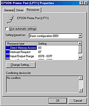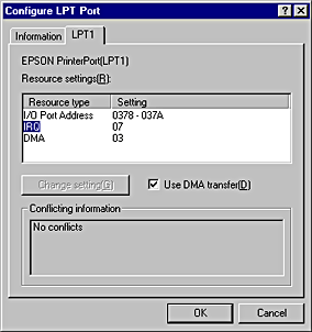 It is possible to make resource settings and enable DMA transfer in the Configure LPT Port dialog box. Refer to the appropriate section below.