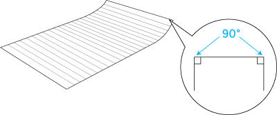 Check that the end of the roll is cut perpendicularly to the edges as shown. If it is cut on a diagonal, recut it to be perpendicular. For A4 and 329-mm width paper, cut along the parallel lines on the back. For 89- and 100-mm width paper, use a triangle.