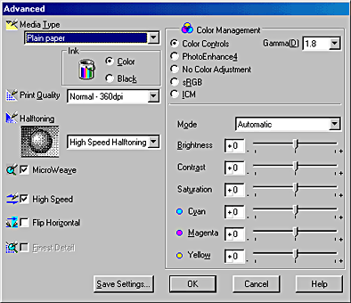 The settings in the Advanced dialog box give you complete control over your printing environment. Use these settings to experiment with new printing ideas, or to fine-tune a range of print settings to meet your individual needs. Once you are satisfied with your new settings, you can give them a name and add them to the Custom Settings list on the Main menu.