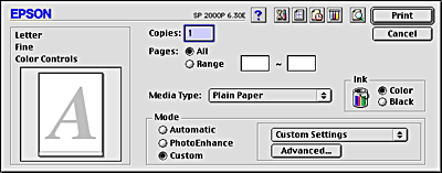 | Click the Custom button in the Print dialog box, then click the Advanced button. The Advanced dialog box appears. |