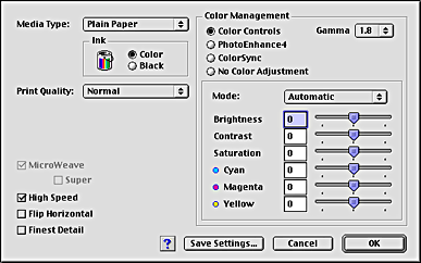 When Automatic is selected as the Mode setting in the Print dialog box, the printer driver takes care of all detailed settings based on the current Media Type and Ink settings. To make the Ink setting, select Color to print in color, or Black to print in black-and-white or grayscale. To make the Media Type setting, see Making the Media Type setting.