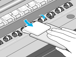 Wipe the printer rollers with the damp cleaning pad. Rotate the printer rollers to ensure that they are thoroughly cleaned.
