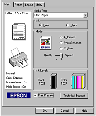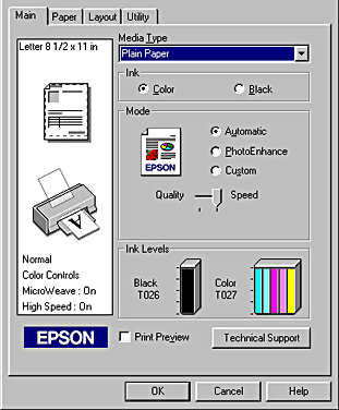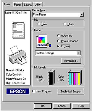 When you select a custom setting, other settings such as Print Quality, Halftoning, and Color Adjustment are made automatically. Changes to these settings are reflected in the display at the left side of the Main menu.