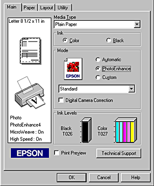 Selecting PhotoEnhance also enables the Digital Camera Correction check box. Select this check box when you are printing photos taken with a digital camera to give your printed images the smooth, natural appearance of photographs taken with a film camera.