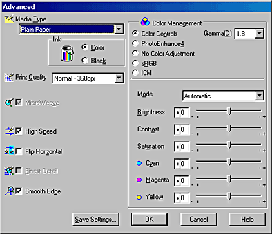 The settings in the Advanced dialog box give you complete control over your printing environment. Use these settings to experiment with new printing ideas or to fine-tune a range of print settings to meet your individual needs. Once you are satisfied with your new settings, you can give them a name and add them to the Custom Settings list on the Main menu.