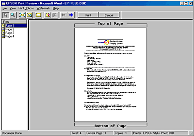 When you send a print job to the printer, the EPSON Print Preview window opens, allowing you to make changes before printing.