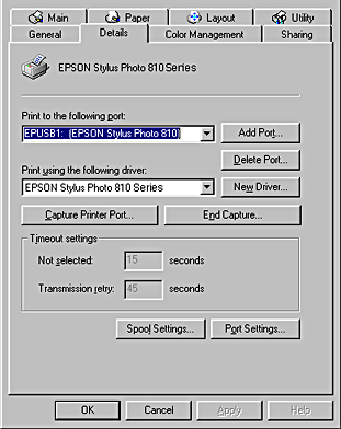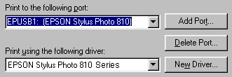 If EPUSBX: (EPSON Stylus Photo 810) is displayed in the Print to the following port list box, then the USB printer device driver and printer software is installed correctly. If the correct port is not displayed, proceed to the next step.