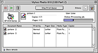 EPSON Spool Manager is similar to Windows Print Manager. If it receives two or more print jobs at one time, it holds them in the order that they were received (with printers on a network this may be called a print queue). When a print job reaches the top of the line, the EPSON Spool Manager sends the job to the printer. From the Spool Manager, you can cancel print jobs. You can also view print status information about the print jobs which have been sent to your printer, as well as pause and resume selected print jobs.