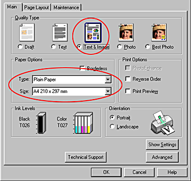 Click the Main tab, and then select Plain Paper and A4 as the Paper Options settings, and Text & Images as the Quality Type setting.