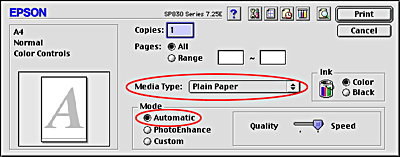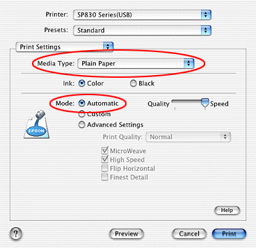 Select Plain Paper as the Media Type setting, and Automatic as the Mode setting.