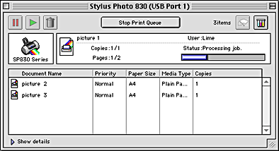 EPSON Spool Manager is similar to Windows Print Manager. If it receives two or more print jobs at one time, it holds them in the order that they were received (with printers on a network, this may be called a print queue). When a print job reaches the top of the line, the EPSON Spool Manager sends the job to the printer. From the Spool Manager, you can view print status information about the print jobs which have been sent to your printer. You can also cancel, pause, and resume selected print jobs.
