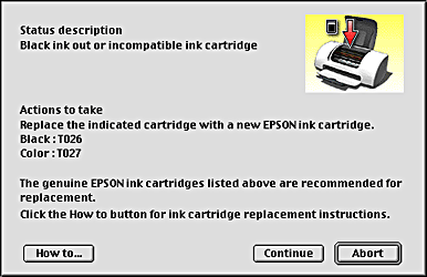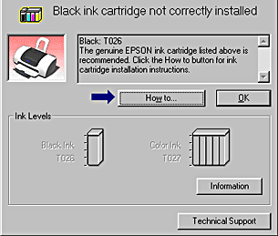 When the ink runs low or out, a How to button appears below the text box. Click How To and EPSON Status Monitor 3 will lead you step-by-step through the cartridge replacement procedure.