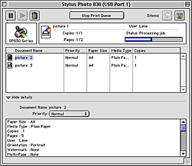 After you send a print job to the printer, you can use the EPSON Monitor3 utility to check, cancel, or change the priority of print jobs that are queued for printing. This utility also shows the status of the job currently being printed.