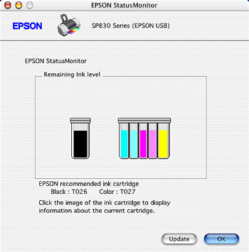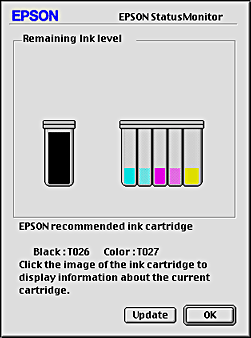 You can also use this utility to check ink levels before printing. When open, EPSON StatusMonitor displays the amount of ink remaining at the time it was opened. To update the ink level information, click Update.
