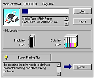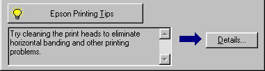 Tips for getting the most out of your EPSON printer software appear in the text box at the bottom of the Progress Meter window. A new tip appears every 30 seconds. For more details on the tip which is currently displayed, click Details.