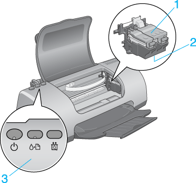 1. Ink cartridge clamps: Hold the ink cartridges in place. Open only when installing or replacing ink cartridges.
