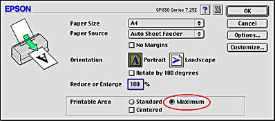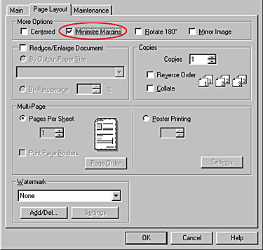 If you extend the printable area by selecting the Minimize Margins check box under More Options (Windows) or the Maximum option for Printable Area (Macintosh) in the printer software, the cut corner on special paper may mar your printout.