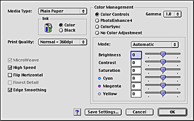 You can make Media Type, Mode, Ink, Copies, and Pages settings in the Print dialog box. From this dialog box, you can also access other dialog boxes, from which you can set the print time, preview the document before printing, and save spool data as a file. Refer to the appropriate section below.
