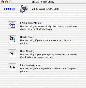 To use the utilities, double-click the EPSON Printer Utility icon in the Applications folder in Macintosh HD (by default setting), and then click the button for the utility that you want to use.