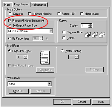 On the Page Layout menu (Windows), select the Reduce/Enlarge Document check box and select the By Output Paper Size option.