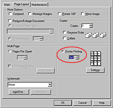 | Select the Poster Printing option under Multi-Page on the Page Layout menu, and then click the up or down arrow to select 2x2, 3x3 or 4x4. |