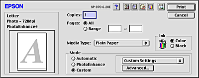 | Click the Custom button in the Print dialog box, then click the Advanced button. The Advanced dialog box appears. |