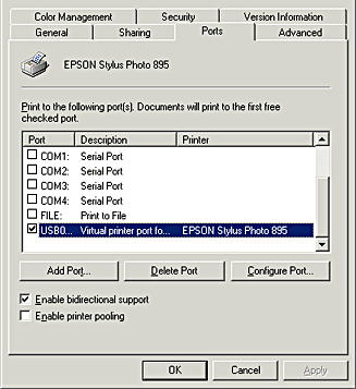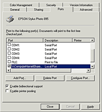 On the Ports menu, make sure that the new port is included in the list and that the corresponding check box is selected. Click OK to close the printer software.