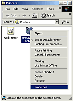 Right-click the icon for your printer, then click Properties on the shortcut menu that appears. The printer software opens.