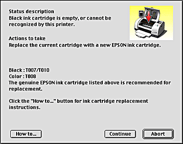 When the ink runs low or out, a How to button will appear. Click How to and EPSON StatusMonitor will lead you step-by-step through the ink cartridge replacement procedure.