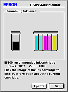 You can also use this utility to check ink levels before printing. When open, EPSON StatusMonitor displays the amount of ink remaining at the time it was opened. To update the ink level information, click the Update button.
