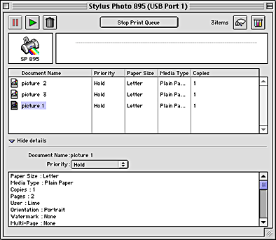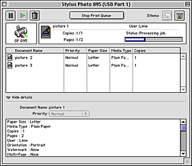 After you send a print job to the printer, you can use the EPSON Monitor3 utility to check, cancel, or change the priority of print jobs that are queued for printing. This utility also shows the status of the job currently being printed.