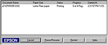 EPSON Spool Manager is similar to Windows Print Manager. If it receives two or more print jobs at one time, it holds them in the order that they were received (with printers on a network this may be called a print queue). When a print job reaches the top of the queue, the EPSON Spool Manager sends the job to the printer. From the Spool Manager, you can view print status information about the print jobs which have been sent to your printer. You can also cancel, pause and resume, or restart selected print jobs.