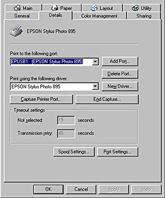 For Windows 98 users, click the Details tab and make sure that EPUSBx: (EPSON Stylus Photo 895) is displayed in the Print to the following port list box. For Windows 2000 users, click the Ports tab and make sure that USBxxx, EPSON Stylus Photo 895 is displayed in the Print to the following port(s) list box.