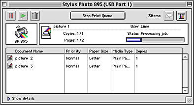 After you send a print job, an EPSON Stylus Photo 895 button will appear in the icon tray. Click this button to open the EPSON Spool Manager.